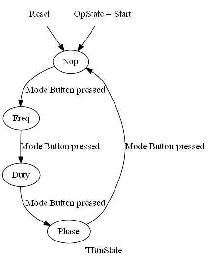 type TBtnState is (Nop, Freq, Duty, Phase); Für die Parameter und Zähler werden sogenannte subtypes deklariert.