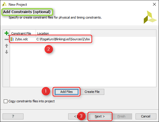 Auf der Seite Add Constraints drücken Sie "Add Files.." und wählen die Zybo.xdc aus.