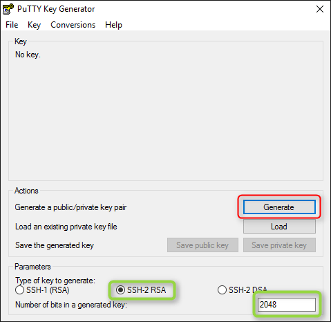 Versichern Sie sich, dass ein SSH-2 RSA Schlüssel der Länge 2048 erzeugt wird und drücken Sie auf den Schalter "Generate".