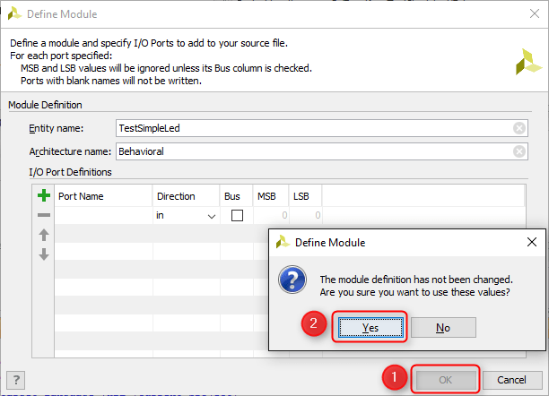 Nachdem die Warnung mit "Yes" bestätigt wurde, taucht die neue Datei TestSimpleLed unter Design Sources auf, ist aber mit nichts weiter verbunden. Das folgende Programmgerüst ist dabei erzeugt worden: