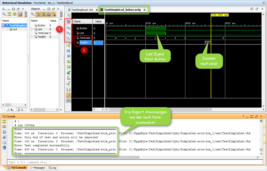 Am Ende der Simulation geht der TestErr-"Daumen" nach oben und zeigt somit die fehlerfreie Abarbeitung der Testbench an.