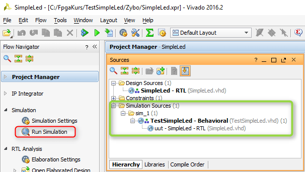 Wie man am Bild unten erkennen kann, ist die Datei SimpleLed.vhd zwei mal aufgeführt. Einmal unter Design-Sources und einmal unter Simulation Sources. Das liegt daran, dass diese Datei sowohl in das FPGA synthetisiert als auch simuliert werden soll.