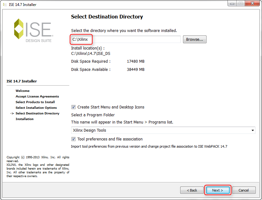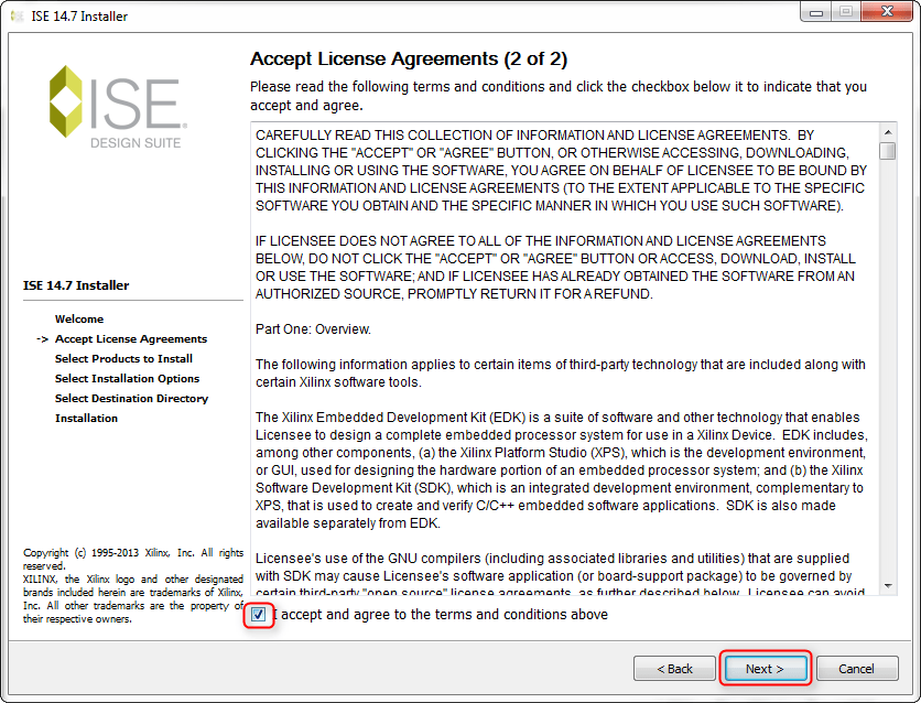 Mittels „Next“ klickt man sich durch die Seiten, akzeptiert die Bedinungen und wählt schließlich ISE WebPACK zur Installation.